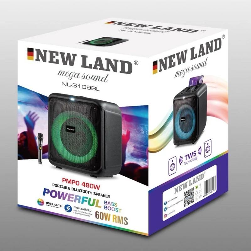 اسپیکر مگا ساند نیولند (Mega sound) مدل: (NL-3109BL) توان: 60 وات RMS سیستم تقویت کننده D کلاسیک 8 اینچی 60 واتی Hi-FI دارای ورژن بلوتوث 5.0 دارای چراغ LED حلقه ای( رینگ لایتی) این رنگ های پر جنب و جوش در هماهنگی با موسیقی می‌رقصند و یک نمایش سمعی بصری زیبا را ایجاد میکنند. تیونر دیجیتال FM PLL اکوی دیجیتال برای کارائوکه وزن: 4.7 کیلوگرم دارای آمپلی فایر 100 واتی کلاسیک DSP نوع باتری: باتری لیتیوم11.1 ولتی 3600 میلی آمپر دارای ورودی میکروفون رادیو FM قابل اتصال به: Bluetooth/ micro sd card (کارت حافظه)/TWS/3.5 mm AuX/USB (فلش)/microphone اسپیکر قابل حمل و سبک نیولند که صدای قدرتمندی را در فرم فشرده ارائه میدهد و آن را به همراه صوت عالی برای همه ماجراجویی های شما تبدیل میکند.