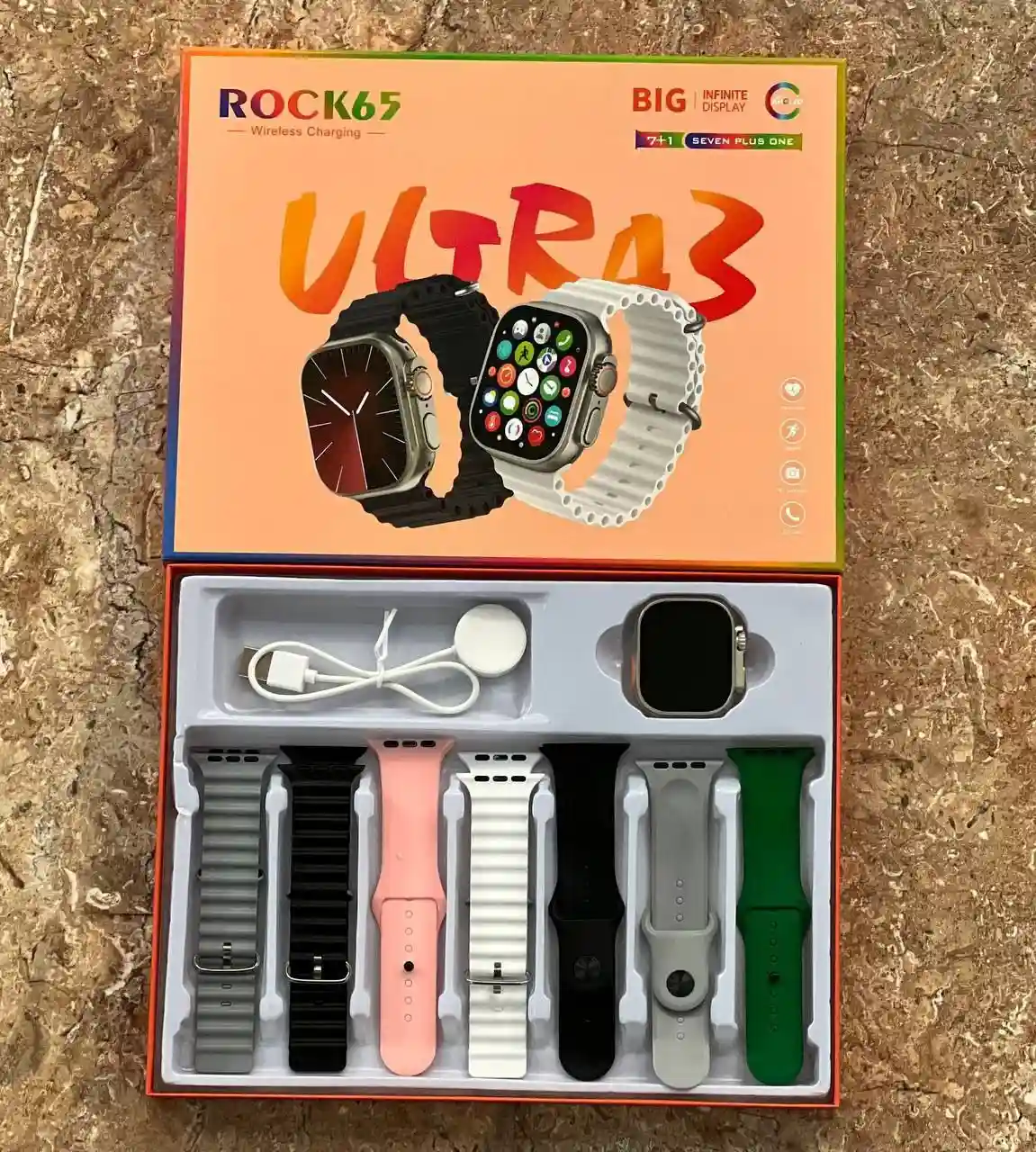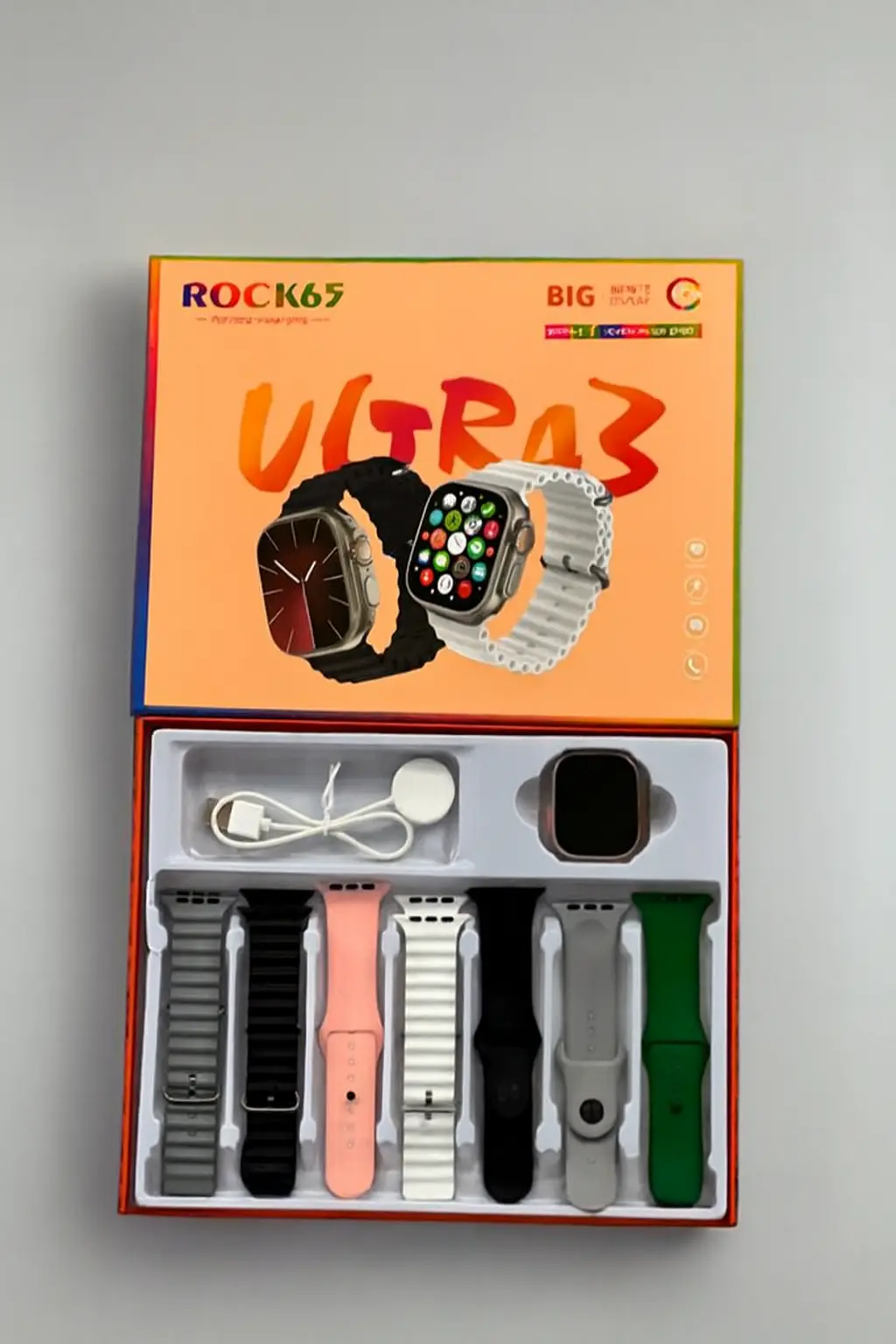 ساعت هوشمند ROCK 65 یکی از مدل‌های جدید و پرفروش سری Ultra است که با طراحی جذاب، پکیج کامل هفت بند متنوع و کیفیت ساخت درجه‌یک عرضه می‌شود. این مدل از نظر ظاهر به نسخه‌های جدید Apple Watch Ultra شباهت دارد و به‌دلیل بسته‌بندی فوق‌العاده شیک و تمیز، انتخابی عالی برای هدیه، استفاده روزمره و استایل رسمی یا اسپرت محسوب می‌شود.