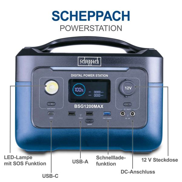 پاور استیشن SCHEPPACH مدل BSG1200MAX با ظرفیت بالا، شارژ خورشیدی و طراحی مقاوم، انتخابی عالی برای کمپینگ، سفر و مواقع اضطراری است.